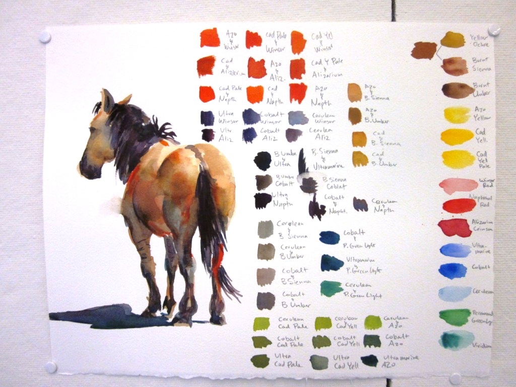The following are paintings I've been working on the past couple weeks. The first is a study of all the watercolor and gouache paint colors and mixing them, all the while doing a small color study of a horse. For the next one I printed out a black and white photo, used colored pencils, and played with warm and cool colors to depict the structure of the horses. I then painted them, using my gut instinct and later one of my thesis committee members (I have one head advisor and an active committee member) and she said that the painting worked because I had the one green colored colt which turned the painting from possibly being a complimentary color painting to a more interesting one. And the last photo is of the wall with a landscape and herd of horses I did before experimenting with the color.